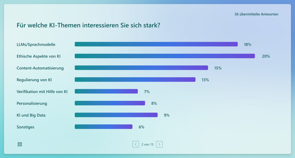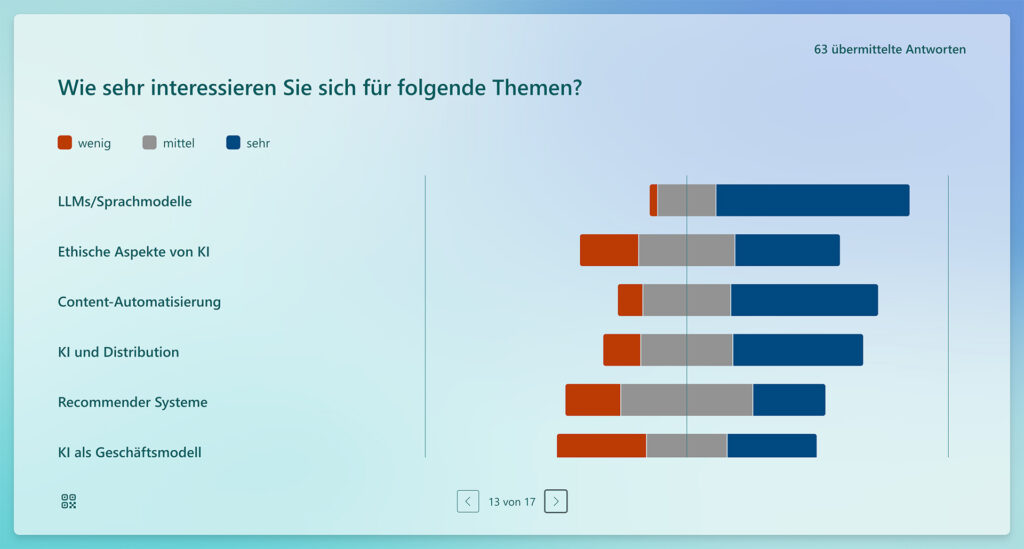 These insights will directly influence the planning of upcoming events. Given the intense interest in large language model applications, the meetup on June 13 at Ippen Digital will focus on AI assistants for various types of text generation. The hackathon focused on generative AI and automated workflows in news production responds to the strong interest in content automation expressed in the survey.