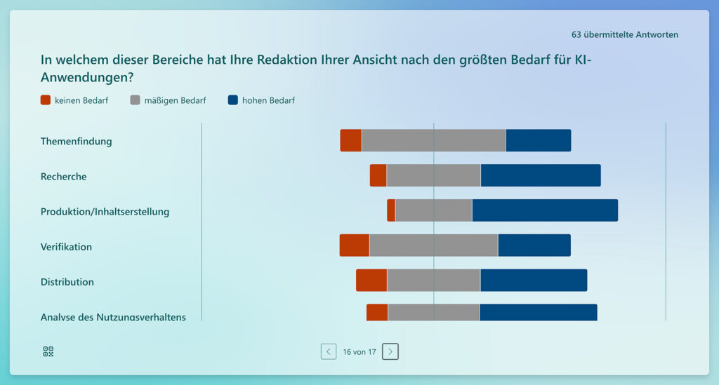 The media survey attracted 63 participants, primarily journalists, followed by programmers and product developers. There was significant interest in topics such as Large Language Models (LLMs), content automation, and AI in distribution.